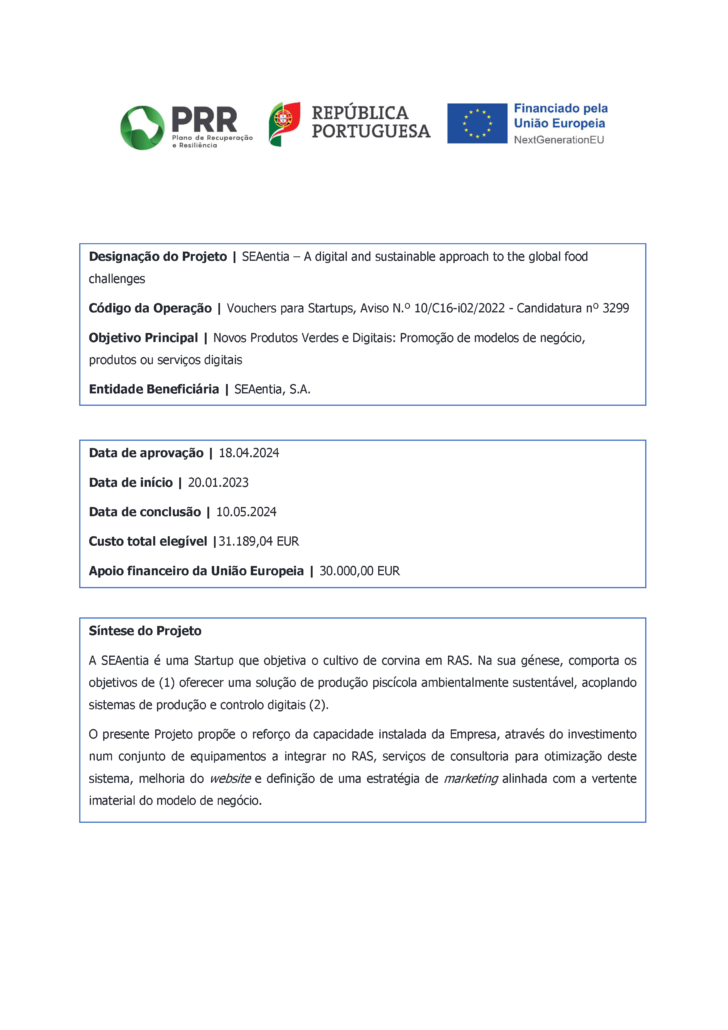 This project proposes the reinforcement of SEAentia’s installed capacity, through the upgrade of some RAS equipment, consultancy services for the optimization of this system, website upgrade and a new market strategy aligned with the intangible part of the business model.